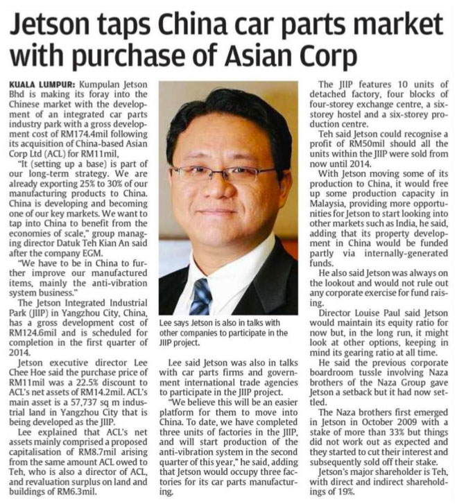 JETSON TAPS CHINA CAR PARTS MARKET WITH PURCHASE OF ASIAN CORPORATION LIMITED – The Star, 10 Feb 2012